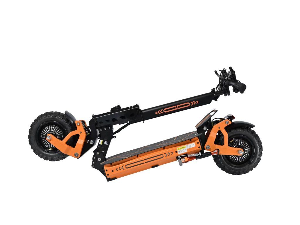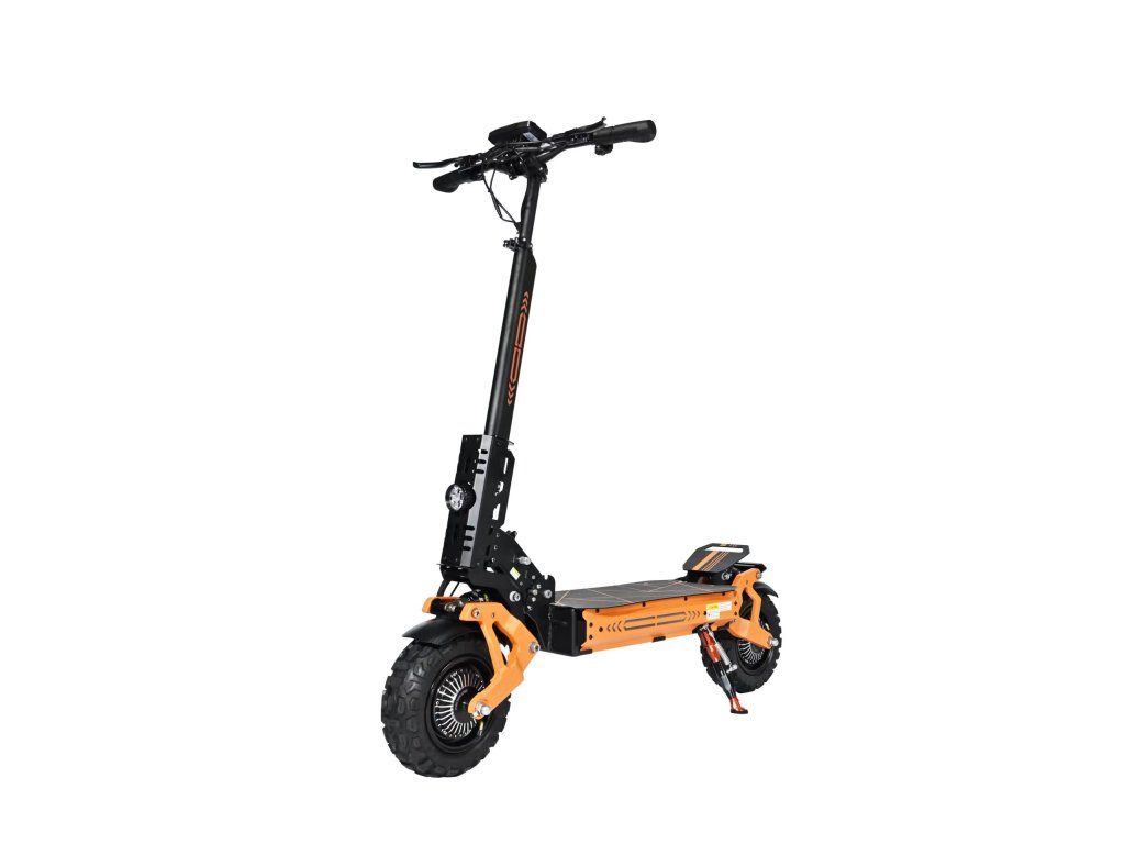 je výkonná elektrická koloběžka navržená pro náročné jezdce, kteří chtějí kombinaci síly, komfortu a výrazného designu. Už na první pohled zaujme robustní konstrukcí a stylovými oranžovými hliníkovými rameny, které nejsou jen designovým prvkem, ale zároveň zajišťují maximální stabilitu a odolnost i v náročnějším terénu.