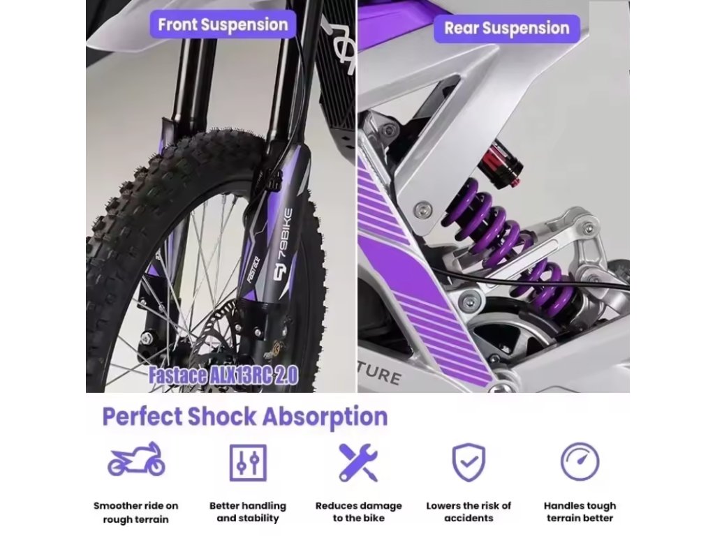 Falcon Pro Offroad je vybaven kvalitním podvozkem, který dobře absorbuje nerovnosti a umožňuje stabilní jízdu i na náročných tratích. Díky své konstrukci je motorka vhodná jak pro rekreační jezdce, tak pro ty, kteří hledají zábavný a výkonný elektrický stroj do terénu.
