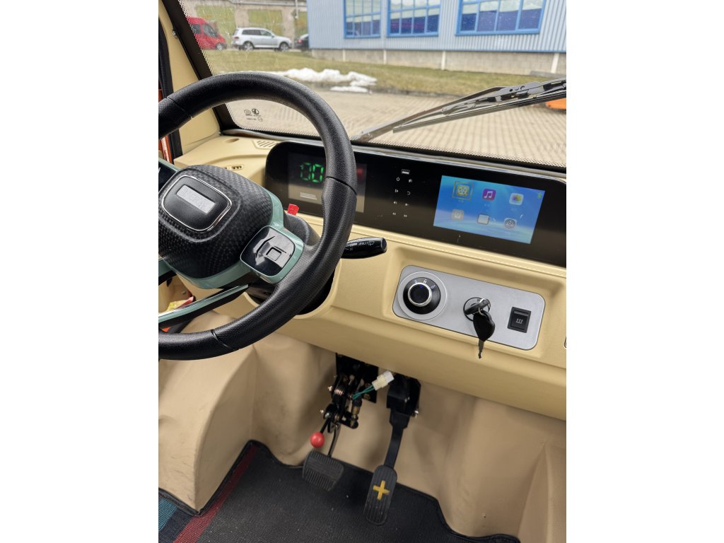 Vozidlo nabízí dvoumístnou kabinu s elektrickým vytápěním, tichý bezemisní provoz a velmi nízké provozní náklady. Ideální řešení všude tam, kde je potřeba spolehlivý pracovní stroj bez hluku a emisí.